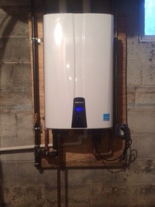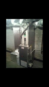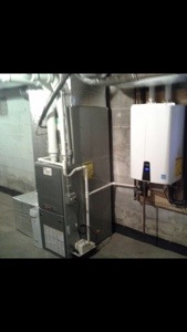 We replaced an old gas furnace with a new 97% high efficiency Trane furnace. We relocated the furnace and ran all new supply ductwork in the mechanical room. We also replaced old 40 gallon water heater with a new Navien 98% wall hung instant hot water heater. Customer in Sudbury Ma will get a $450 rebate for the Trane gas furnace and a $800 rebate for the Navien water heater. Plus they got 0% financing for 7 years through Mass Save. In addition will save 30% on there gas bills from both new appliances.
